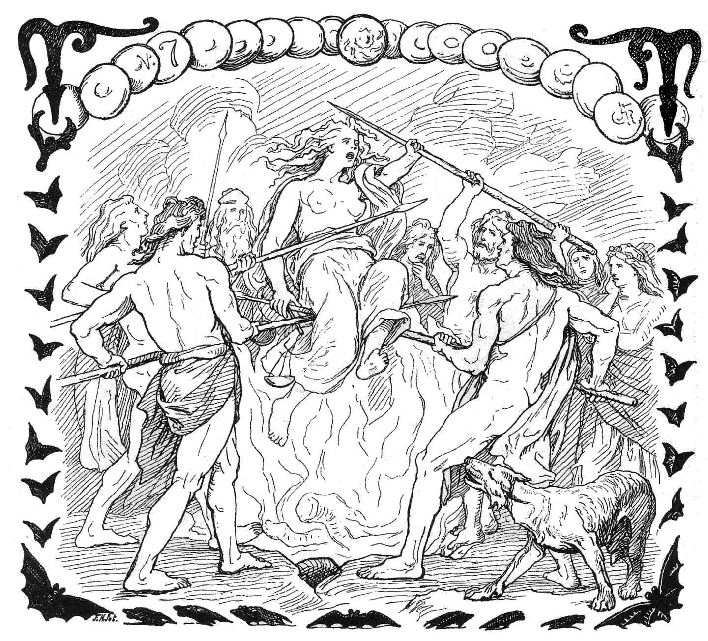 Gullveig is executed, illustration by Lorenz Frølich (1895).