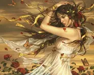 According to Nonnus' Dionysiaca, Aglaea is one of the "dancers of Orchomenus" (i.e. the Charites, per Pindar), along with Pasithea and Peitho, who attend Aphrodite. When Aphrodite jealously attempts to weave better than Athena, the Charites help her do so, with Aglaea passing her the yarn. Aglaea also acts as Aphrodite's messenger, and is sent to find and bring a message to Eros, who travels back to Aphrodite much faster because he can fly whereas Aglaea cannot. Aglaea here is referred to as a Charis (singular of Charites), but other characters not of this group are also named Charis, including by Aglaea.