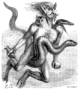 | “ | Haborym, demon of fires, also called Aym. He bears the title of duke in hell; he appears riding a viper, with three heads, one of a serpent, another of a man, the thirdof a cat. He holds a lighted torch in his hand. He commands twenty-six legions. Some say he is the same as Ranm; which seems at least doubtful to us.[3] | ” |