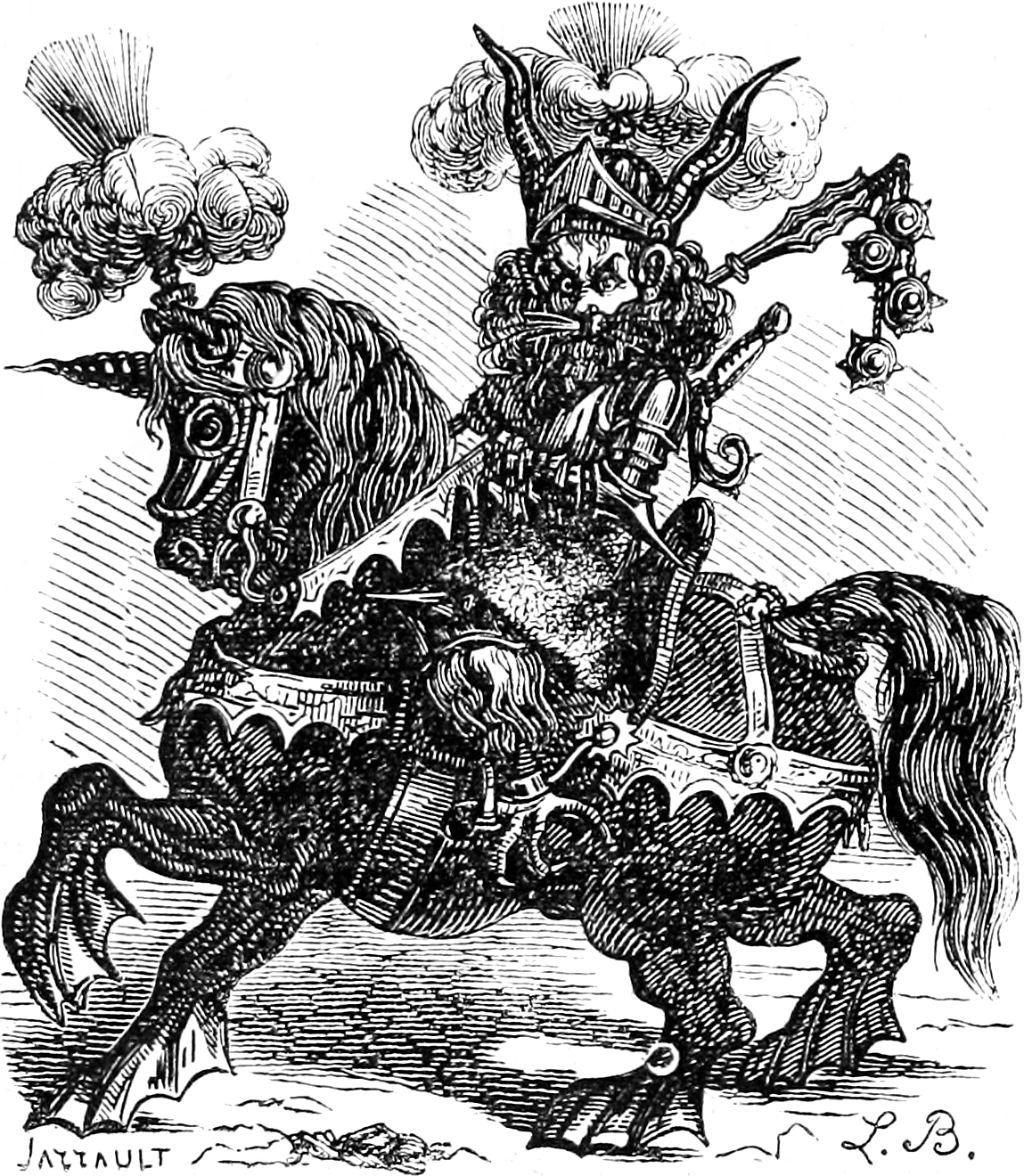| “ | Alocer , powerful demon, grand duke of hell; he appears hairy as a knight, mounted on an enormous horse; his figure recalls the features of the lion; he has a fiery complexion, burning eyes; he speaks with gravity; he teaches the secrets of astronomy and the liberal arts; he dominates thirty-six legions.[3] | ” |