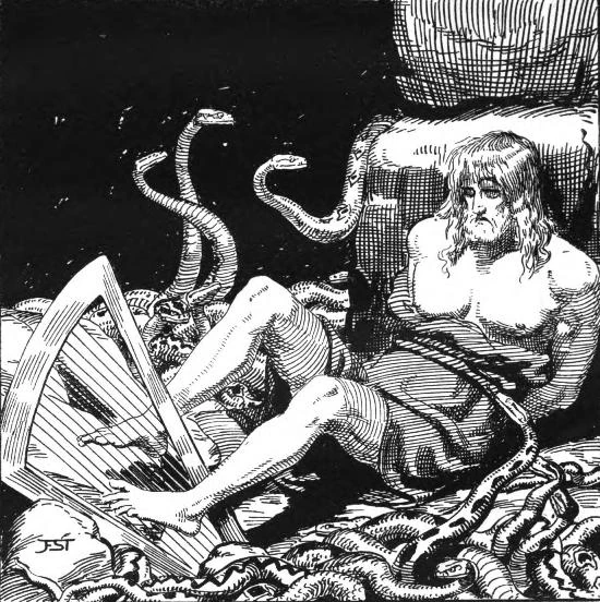 As the brothers and their companions arrive at Atli's door, Vingi admits to his treachery and is promptly slain. Atli then attacks the five guests with a force of 30. The battle rages for hours and Guðrún joins it on the side of her brothers, throwing away her jewelry. Finally the children of Gjúki are overpowered, having slain 18 of Atli's warriors. Atli trades accusations with his wife and orders the execution of Gunnarr and Hǫgni. Following a comical episode with Hjalli, Atli's cook, Atli has the brothers executed. Hǫgni dies laughing while Gunnarr dies playing a harp with his toes.