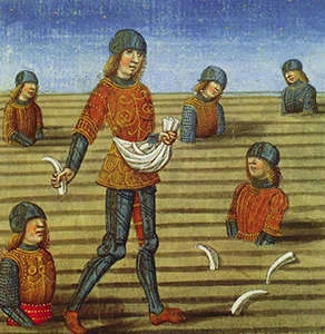 After sowing the dragon's teeth, several men (the Spartoi) spring from the ground.