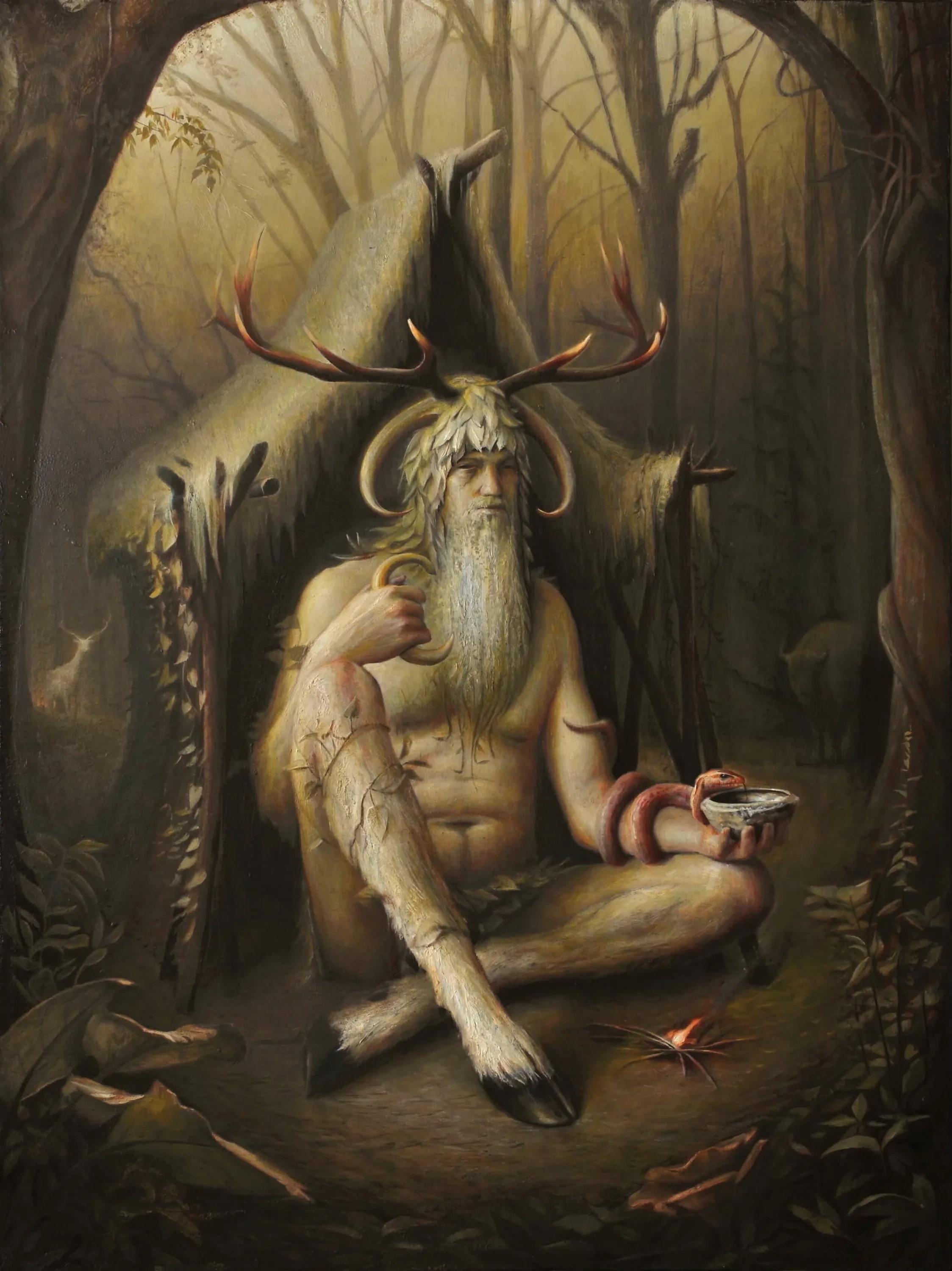Cernunnos (known as Dīs by Romans) was the name given to the "Horned God" of Celtic mythology. He is interpreted as a god of fertility and hunting. He was a god of fertility, life, animals, wealth, and the underworld. The name itself is only attested once, on the 1st-century Pillar of the Boatmen, but he appears all over Gaul, and among the Celtiberians. Cernunnos is depicted with the antlers of a stag, sometimes carries a purse filled with coin, often seated cross-legged and often associated with animals and holding or wearing torcs, are known from over 50 examples in the Gallo-Roman period, mostly in north-eastern Gaul.