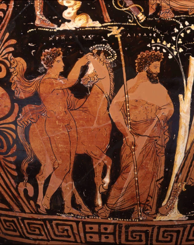 Cretheus crowning a horse (Hippe?), while Aeolus is holding a bird-tipped scepter