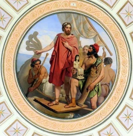 After Aegyptus commanded that his fifty sons should marry the Danaides, Danaus elected to flee instead. To that purpose, he built a ship on the advice of Athena,[1] the first ship that ever was.[7] In it, he fled to Argos, to which he was connected by his descent from Io, a priestess of Hera at Argos, who was wooed by Zeus and turned into a heifer and pursued by Hera until she found asylum in Egypt. Argos at the time was ruled by King Pelasgus, the eponym of all autochthonous [indigenous] inhabitants who had lived in Greece since the beginning, also called Gelanor ("he who laughs"). The Danaides asked Pelasgus for protection when they arrived, the event portrayed in The Suppliants by Aeschylus. Protection was granted after a vote by the Argives.