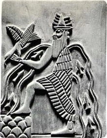 Detail of The Adda Seal (circa 2300 BCE). The figure with streams of water and fish flowing from his shoulders is Ea (Sumerian Enki), god of subterranean waters and of wisdom. Behind him stands Usimu (Sumerian Isimud), his two-faced vizier (chief minister).