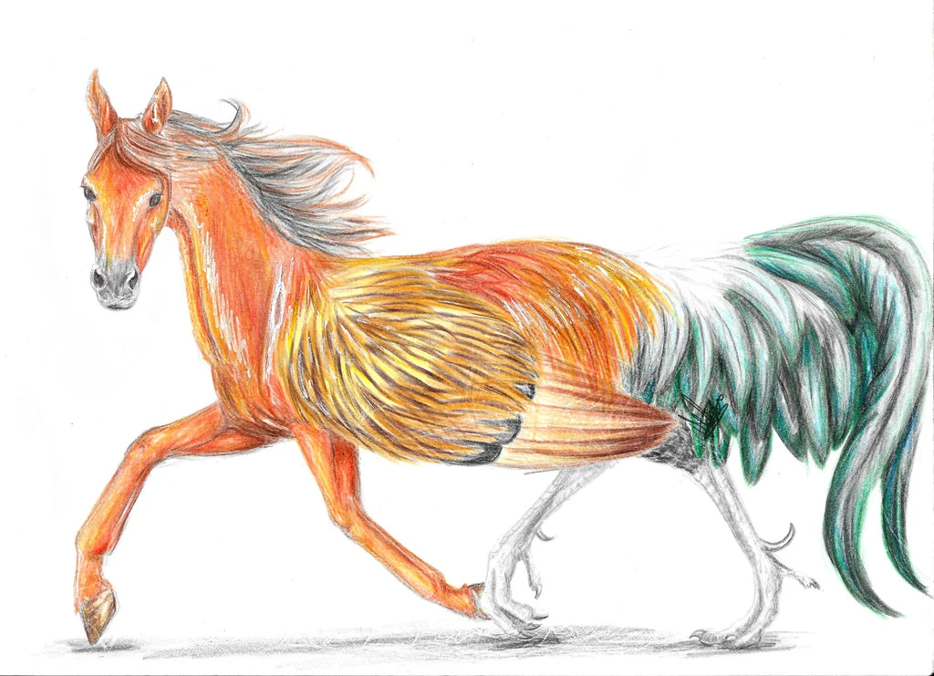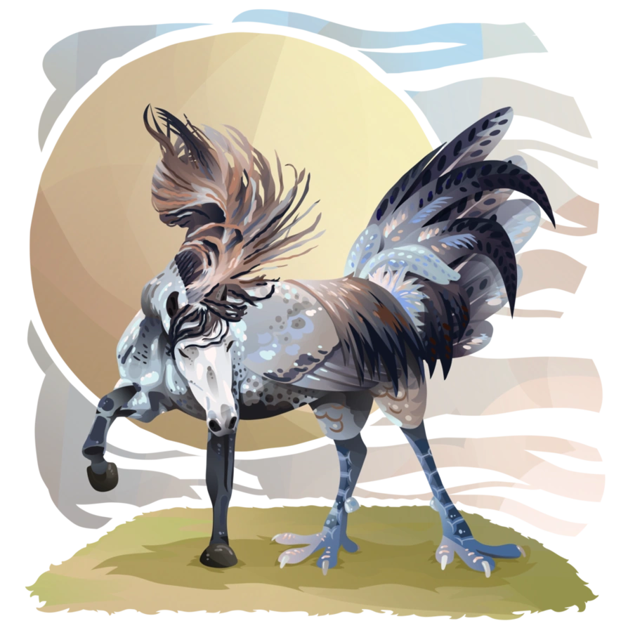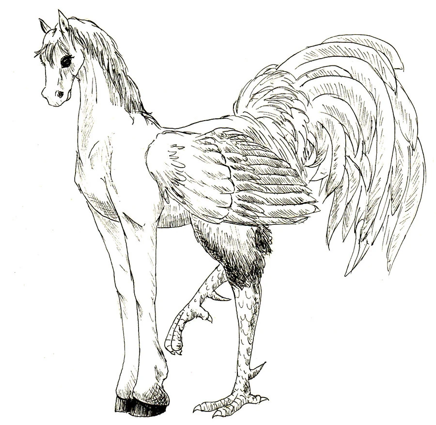 In Greek mythology, a hippalectryon (or hippalektryon, from Greek ἱππαλεκτρυών) is a hybrid creature, half-horse and half-rooster, with yellow feathers. The front half is that of a horse, the rear half a rooster's wings, tail and legs.