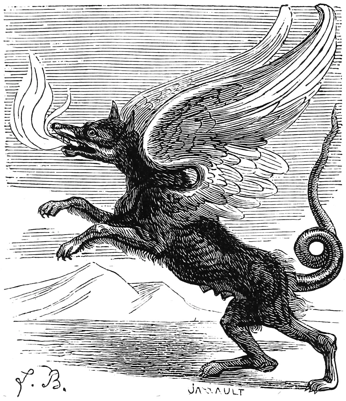 Marchosias is a great and mighty Marquis of Hell, commanding thirty legions of demons. In the Ars Goetia, the first book of The Lesser Key of Solomon (17th century), he is depicted as a wolf with gryphon's wings and a serpent's tail, spewing fire from his mouth, but at the request of the magician he may take the form of a man.
