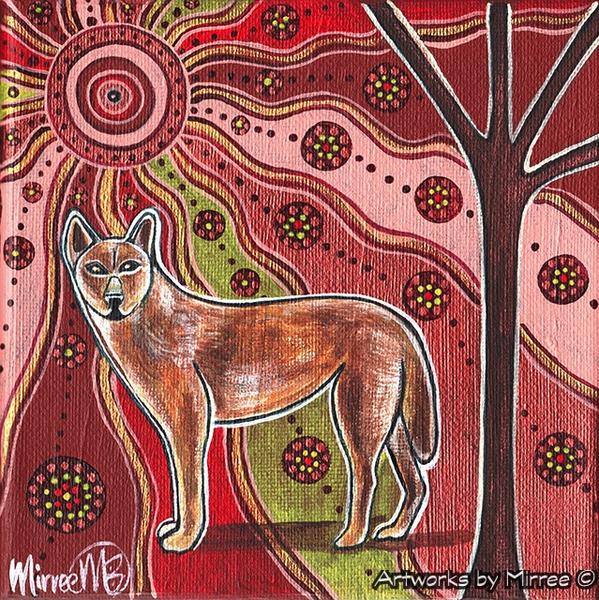 One day, Marindi was passing by the dry bed of a watercourse when he heard a voice saying “Come out and fight.” It was Adno-artina, the gecko lizard, who offered the challenge. Marindi agreed to the fight, but the lizard, seeing Marindi’s huge teeth, decided the battle should be put off until the evening when she would be able to see better. The lizard tied a string around the root of her tail to prevent courage from leaving her body. As they fought, Adno-artina seized Marindi by the throat. The dog’s blood poured out and dyed all of the rocks in the creek red. To this day red ochre used extensively for decorative purposes, is obtained from the spot where the battle took place[1].