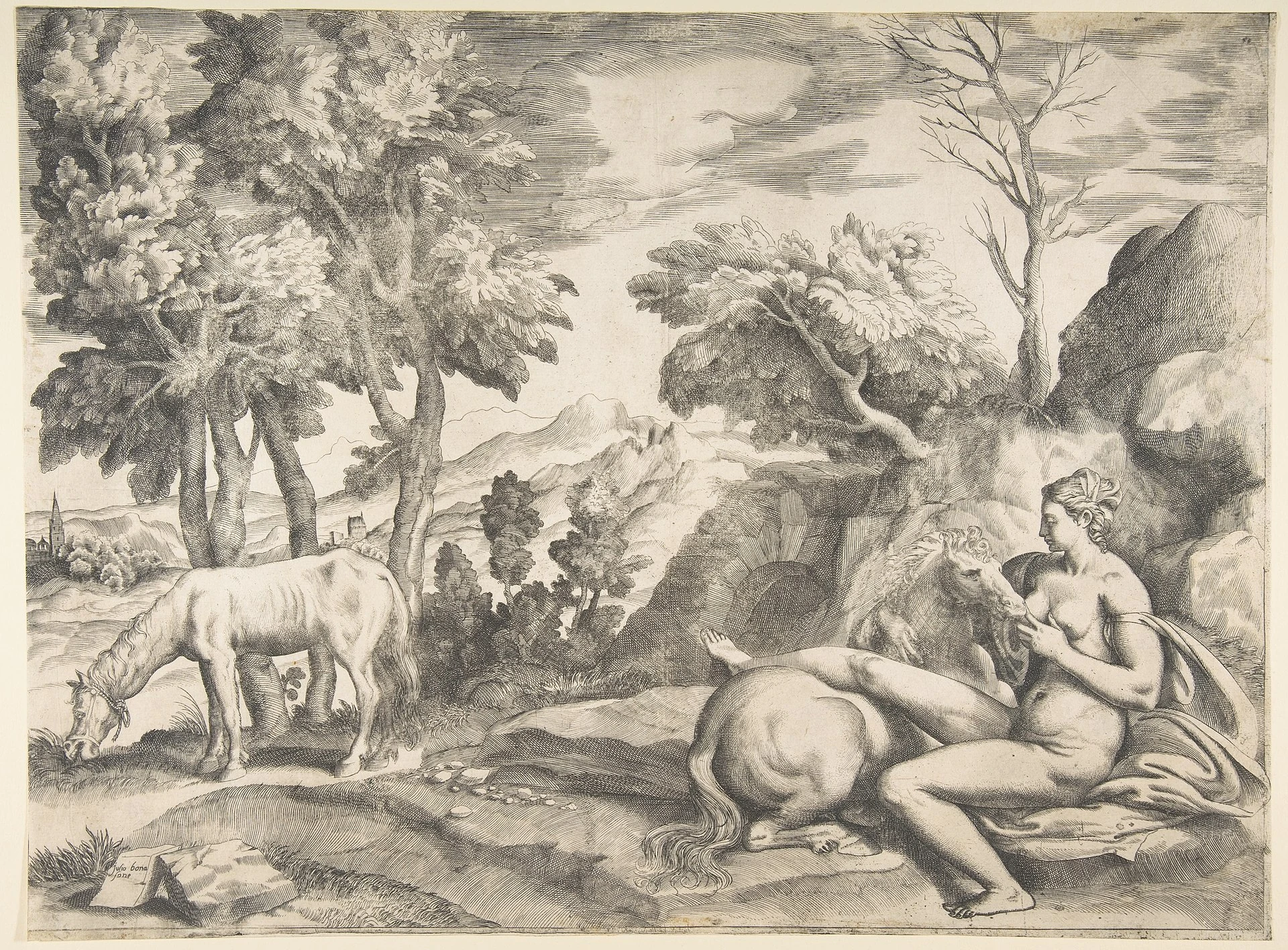 Saturn in the guise of a horse being suckled by the nymph Philyra, engraving by Giulio Bonasone ca. 1513–76