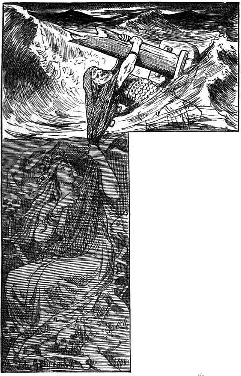 Rán pulls her net beside her husband Ægir as depicted by Friedrich Wilhelm Heine (1845–1921) after an original by Friedrich Wilhelm Engelhard (1813–1902)