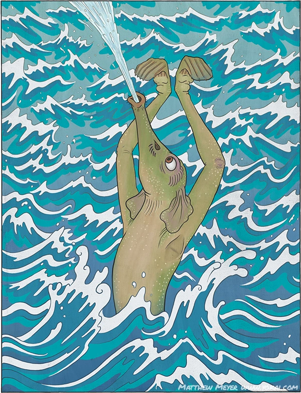 Shiofuki is an elusive aquatic yokai with elephantine ears and a trunk-like mouth. It has human-like arms, but its hands are webbed and resemble the fins of a fish. Its body is covered in fine hairs which the salt in the ocean sticks to.