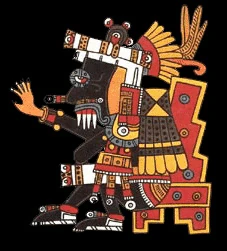 Tlaloc, He Who Makes Things Sprout, is the god of rain, lightning, and thunder. He is a fertility god, but also a wrathful deity. He is responsible for both floods and droughts Tlaloc is also associated with caves, springs, and mountains, most specifically the sacred mountain where he was believed to reside. His animal forms include herons and water-dwelling creatures such as amphibians, snails, and some sea creatures, particularly shellfish. The Mexican marigold, Tagetes lucida, known to the Aztecs as yauhtli, was another important symbol of the god, and was burned as a ritual incense in native religious ceremonies. Tlaloc is commonly depicted as a goggle-eyed blue being with jaguar fangs. Often he is presented wearing a net of clouds, a crown of heron feather and foam sandals. He carries rattles to make thunder.