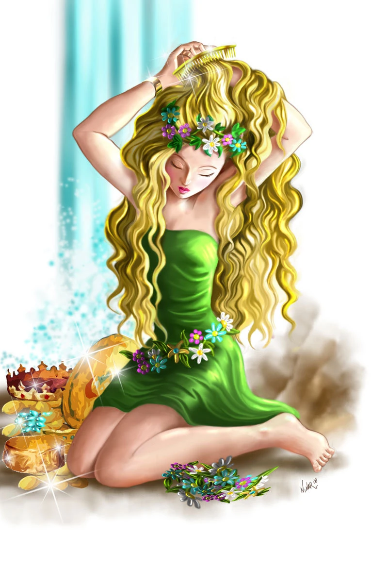 Always female, she is a creature of extraordinary beauty believed to live in fountains, rivers, waterfalls or forested regions with pure water. Xanas are usually depicted in one of two ways. In one, they appear as young Nordic girls, very beautiful, with long blonde hair. She is usually described as small or slender with long blonde or light brown hair (most often curly), which she tends to with gold or silver combs woven from sun or moonbeams. This image is usually associated with xanas who possess a treasure or those under a spell.